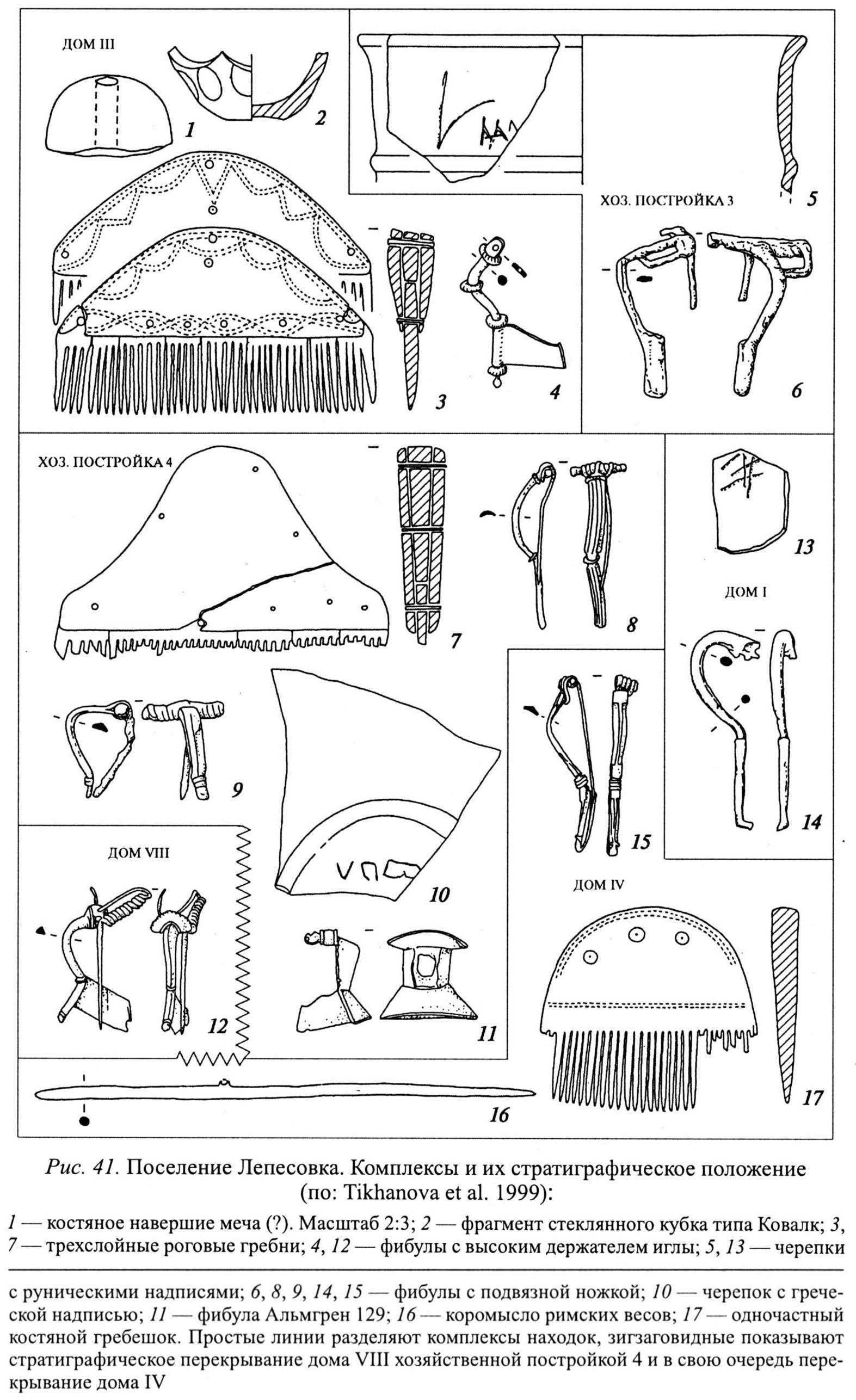 ^ Рис. 41. [Стр. 126] Поселение Лепесовка.Комплексы и их стратиграфическое положение(по: Tikhanova et al. 1999):1 — костяное навершие меча (?). Масштаб 2: 3; 2 — фрагмент стеклянного кубка типа Ковалк; 3, 7 — трехслойные роговые гребни; 4, 12 — фибулы с высоким держателем иглы; 5, 13 — черепки с руническими надписями; 6, 8, 9, 14, 15 — фибулы с подвязной ножкой; 10 — черепок с греческой надписью; 11 — фибула Альмгрен 129; 16 — коромысло римских весов; 17 — одночастный костяной гребешок. Простые линии разделяют комплексы находок, зигзаговидные показывают стратиграфическое перекрывание дома VIII хозяйственной постройкой 4 и в свою очередь перекрывание дома IV.