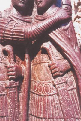 ^ Вклейка 3.Порфировые статуи тетрархов из собора св. Марка в Венеции.Деталь (Хорошо видно украшение ножен мечей, скорее всего, в технике клуазоне).