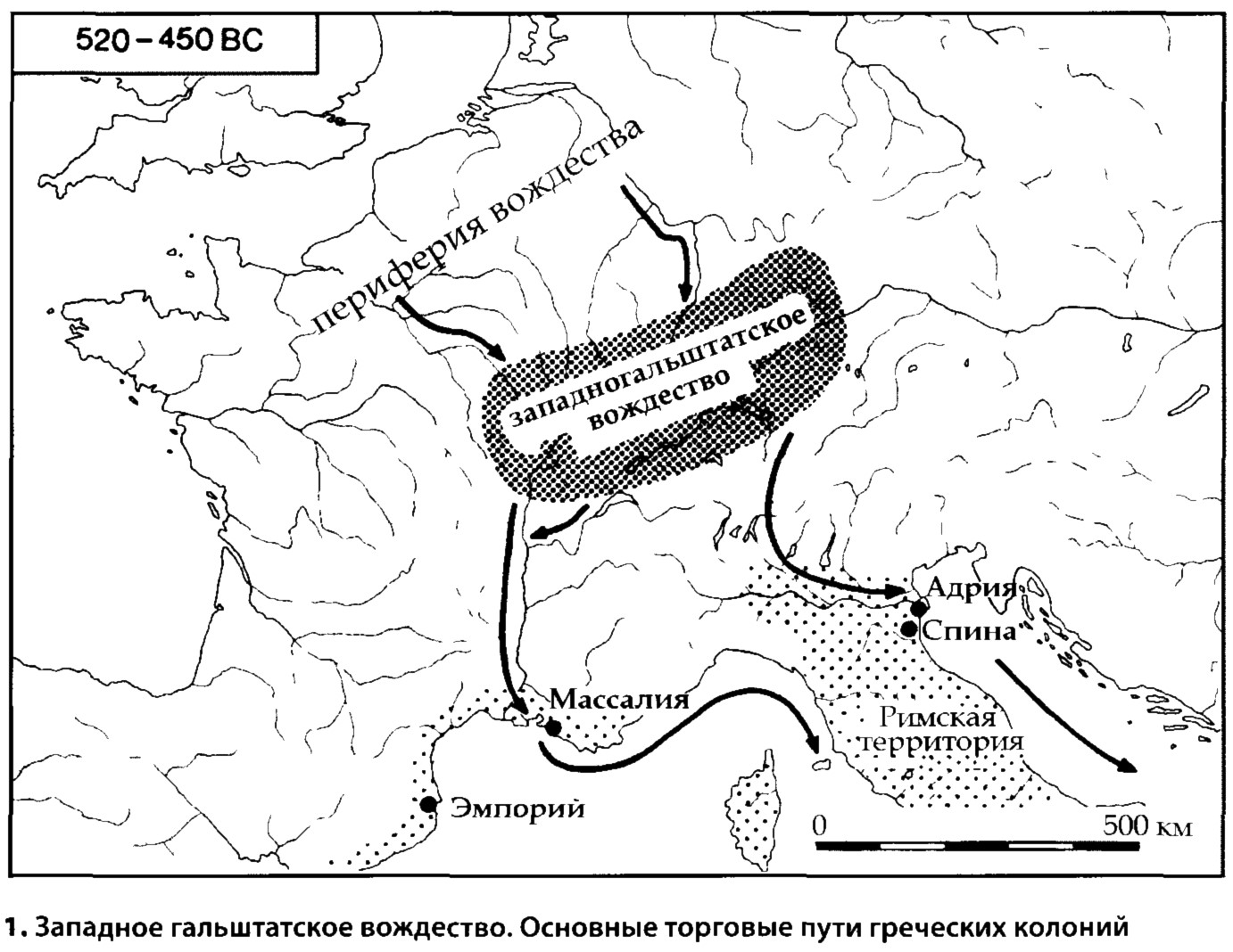 1. Западное гальштатское вождество. Основные торговые пути греческих колоний.