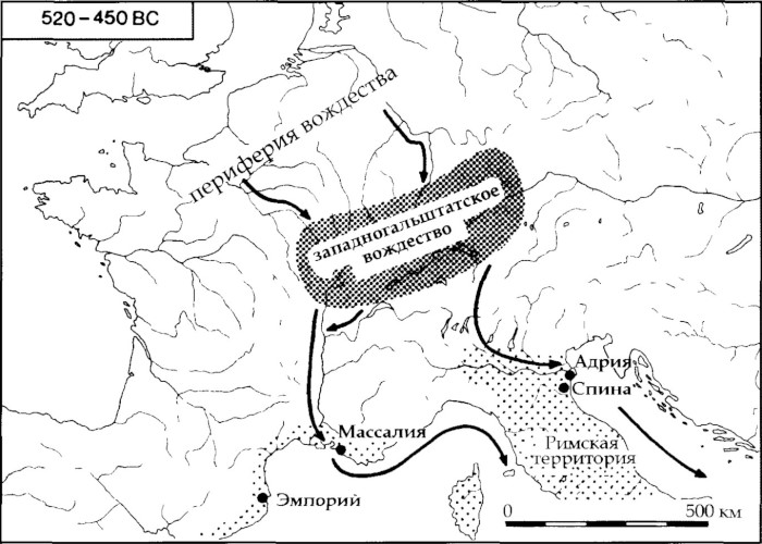 Хотя очевидно, что социальные и экономические структуры этого общества были неоднородными и распределение благ базировалось на обычном праве, необходимое равновесие и стабильность сохранялись вплоть до тех пор, пока фокейцы не основали Массалию. В последующие полтора века (600-450 годы до н.э.) произошла трансформация западногальштатской культуры (археологически это переход от гальштата C к гальштату D). Было найдено большое количество греческих, этрусских и массалиотских предметов роскоши, появились очень богатые захоронения. Возросшее число укреплённых городищ свидетельствует о могущественной, процветающей аристократии. Греческий спрос на товары с севера привёл к появлению сильного вождества в сердце варварского мира Западной Европы, способного контролировать потоки престижных вещей с юга (ил. 1).
