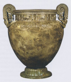 Правда, некоторые импорты, обнаруженные в ареале гальштатской культуры, относятся к довольно раннему времени. Так, ойнохои из Вильсингена и Каппеля датируются последней третью VII века до н.э. Гидрия из Грехвиля (кантон Берн, Швейцария) высотой 57 см, найденная в кургане с трупосожжением, была изготовлена в одной из греческих колоний в Италии в 580-570 годах до н.э. [16] Особенно замечательна её ручка в виде крылатой повелительницы зверей, окружённой четырьмя львами и увенчанной орлами и змеями (ил. 2). В руках богиня держит зайца, символ плодовитости. [17] Аналогичные сосуды найдены в Трейи и датируются 565-550 годами до н.э. (ил. 3). Гидрии из Грехвиля и Трейи можно рассматривать как результат эксперимента спартанских мастеров по бронзе, на которых оказали влияние резчики по слоновой кости и изготовители терракотовых рельефов для больших глиняных ваз. [18] Таким образом, вполне вероятно, что роскошные винные приборы экспортировались в варварские регионы не только из Массалии, но и из некоторых других регионов Великой Греции. Этрусские кубки, также встречающиеся в Средней Европе, были созданы в пределах VI века до н.э. или после 525 года до н.э. Фрагментарный характер археологических источников не позволяет говорить о значительном потоке импортных изделий в это время.