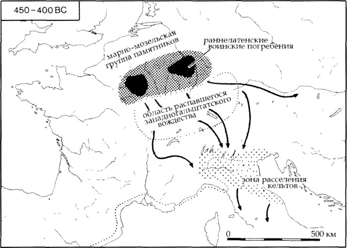 Одновременно с гибелью центров западногальштатского вождества рождается новый активный (пассионарный) военный социум с двумя центрами — в Марне и Гунсрюк-Эйфеле. В V веке до н.э. бывшая отсталая периферия стала центром культурного комплекса, известного как марно-мозельская группа западной раннелатенской культурной провинции (ил. 7).