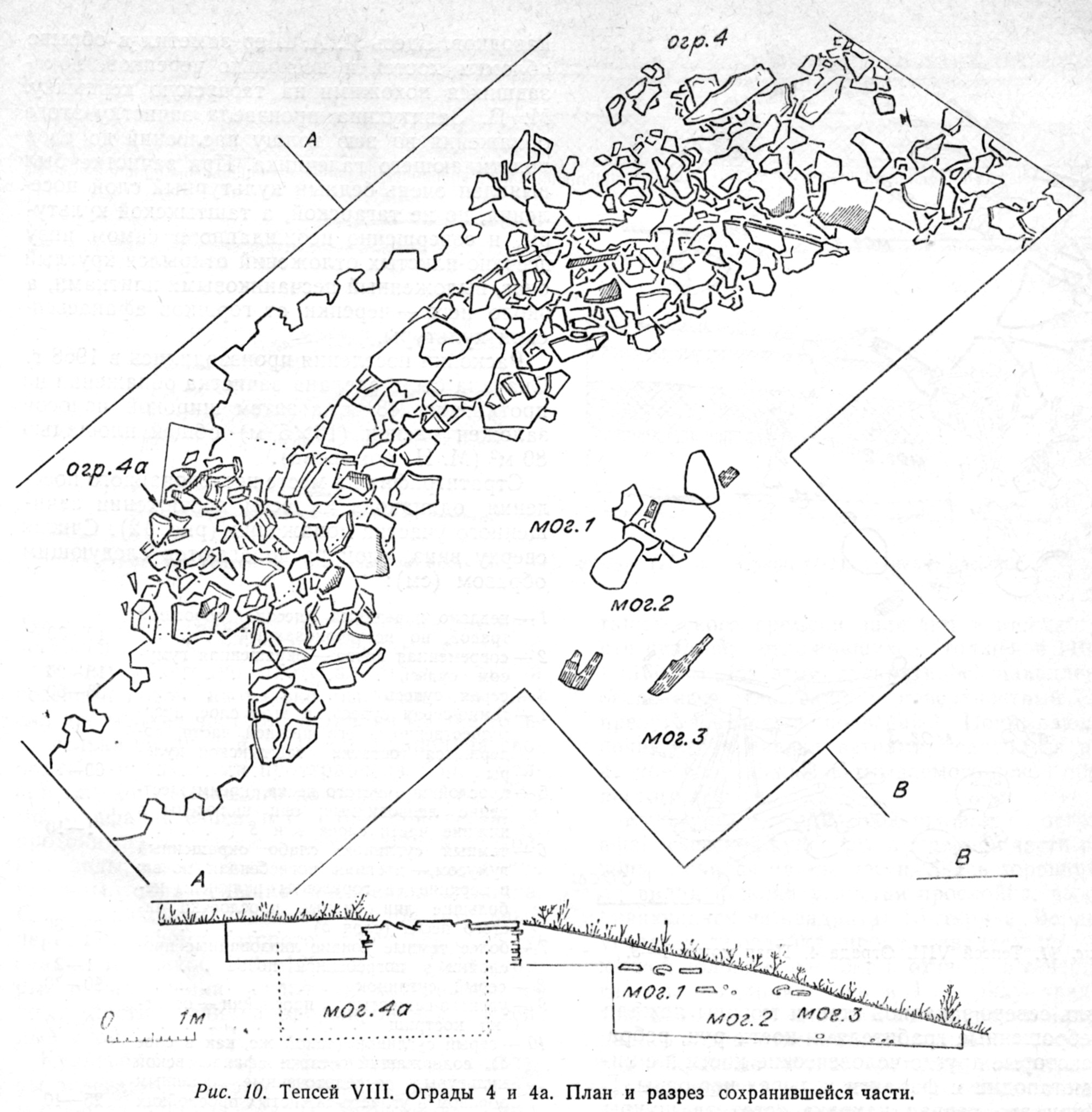 Рис. 10. Тепсей VIII. Ограды 4 и 4а. План и разрез сохранившейся части.(Открыть Рис. 10 в новом окне) |