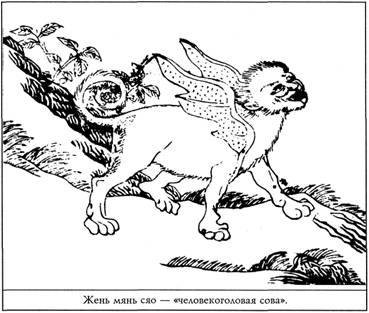 «Человекоголовая сова», жень мянь сяо ( [4] ), обладая головой человека, телом хищника и перепончатыми крыльями, скорее напоминает галогрифа, чем грифона.