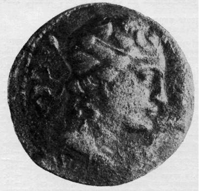 На территории Средней Азии, судя по греко-бактрийским монетам, праксителевский образ головы Диониса известен был уже в первой половине II века до н.э., судя по монетам царя Агафокла, изображавшего себя в виде Диониса в плющевом венке с двумя крупными цветками надо лбом, со свисающими на шею локонами и с тирсом, показанным за головою 1 [41] (рис. 12).