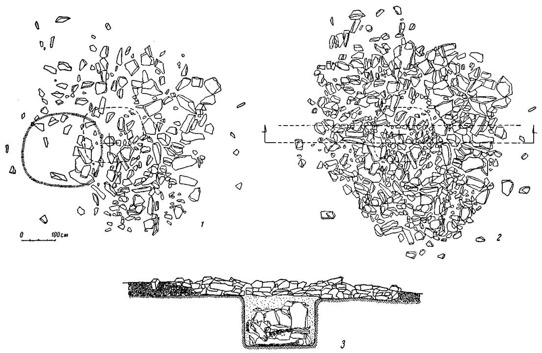 По внешнему виду наземных сооружений к моменту их исследования все эти памятники можно разделить на две, резко отличные одна от другой группы. В первую группу войдут объекты, сооружения которых до разборки представляли собой как бы бессистемные, но компактные наброски из разномасштабных обломков горных пород. Величина и вес камней в общем соотносились здесь с размерами самих курганов. Среди них встречались как сравнительно небольшие по площади и невысокие, так и весьма крупные. Например, одно из самых значительных по объёму сооружений было сложено преимущественно из массивных, часто плитообразных глыб (рис. 1, 1). В остальном же эти объекты, входящие главным образом в аргалыктынские могильники, по внешним признакам очень сходны. Степень задерновки их невелика, и потому общие очертания и границы курганов определялись достаточно хорошо ещё до расчистки последних. Форма их в плане почти всегда близка к округлой.