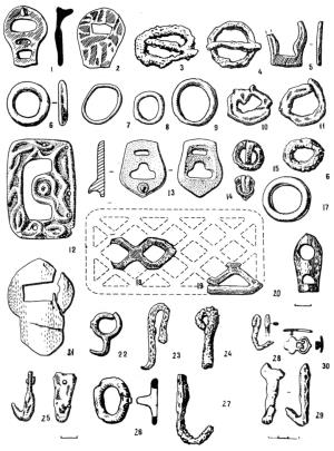 Комаркова, м. 5 (1), 7 (2), 9 (9), 12 (10), 17 (3, 4), 26 (6, 11), из разрушенных могил (7-8, 17), Салбык, м. 2 (13), 3 (14), 7 (12); Абаканская Управа, 1899, к. 5, м. 1 (6); Оглахты I, м. 7 (20); Новая Чёрная IV, м. 8 (18), 30 (21); Новая Чёрная V, м. 2 (24), 5 (19), 7 (22); Барсучиха II, м. 7 (25); Чегерак (23); Красная Грива, м. 2 (29, 30). 9 (27), 14 (26). 1, 5, 6-9, 17-19, 22, 28 — бронза; 3-4, 10-11, 14-16, 23-24, 25-29 — железо; 2 — слюда, 21 — кожа, 20 — кость.