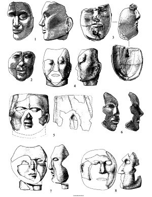 Маски из склепов на реке Абакан: 1-5 — Сыры, 6 — Белый Яр III, 7 — Уйбат I, склеп 6.