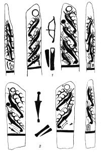 ^ Табл. 126. Оленные камни. (С. 241) Ховд (Кобдоский) аймаг. Муст сумын. Посёлок Баян Зурх.1 — оленный камень №1; 2 — оленный камень №3.(Открыть Табл. 126 в новом окне) |