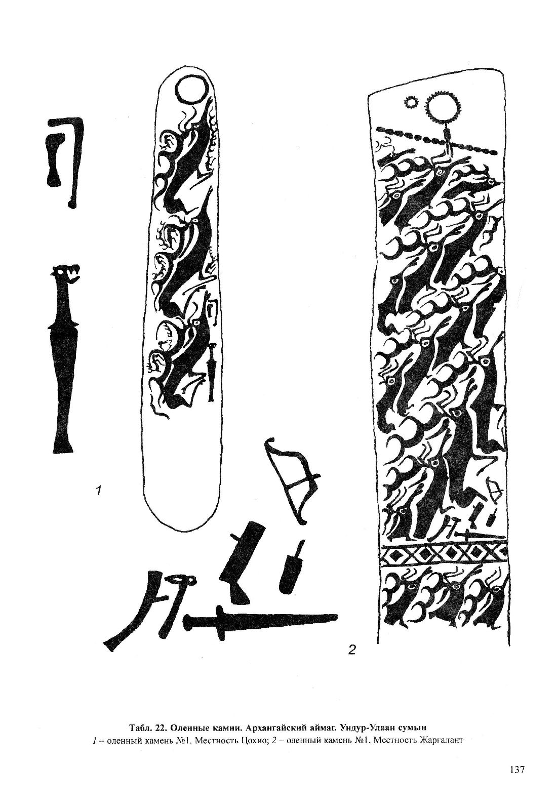 ^ Табл. 22. (С. 137) Оленные камни. Архангайский аймаг. Ундур-Улаан сумын.1 — оленный камень №1. Местность Цохио; 2 — оленный камень №1. Местность Жаргалант.(Открыть Табл. 22 в новом окне) |