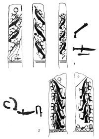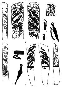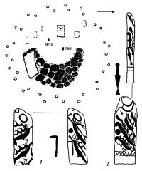 ^ Табл. 15. (С. 130) Оленные камни. Архангайский аймаг. Ихтамир сумын. Шавартийн ам. Плиточная оградка №1.1 — оленный камень №4; 2 — оленный камень №3.(Открыть Табл. 15 в новом окне) |