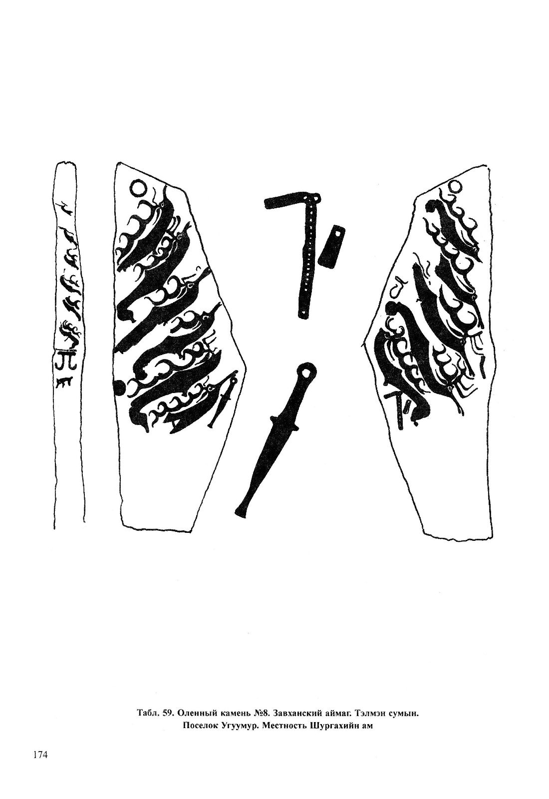 ^ Табл. 59. (С. 174) Оленный камень №8. Завханский аймаг. Тэлмэн сумын. Посёлок Угуумур. Местность Шургахийнам.(Открыть Табл. 59 в новом окне) |