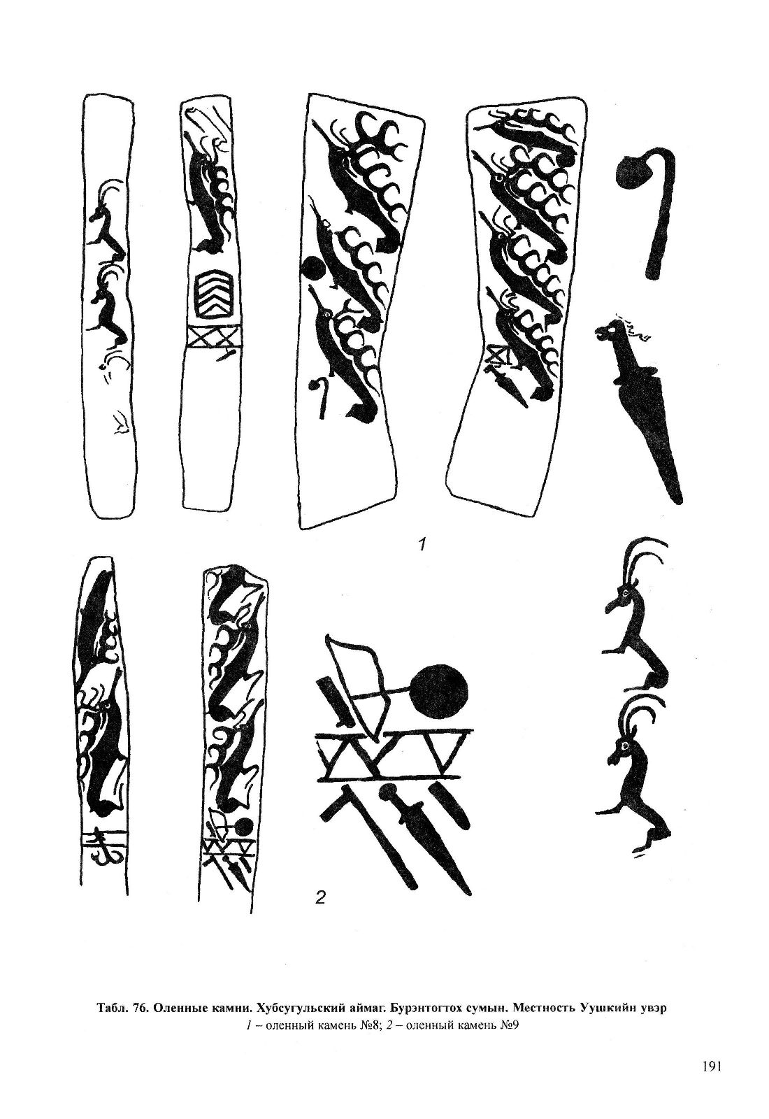 ^ Табл. 76. (С. 191) Оленные камни. Хубсугульский аймаг. Бурэнтогтох сумын. Местность Уушкийн увэр.1 — оленный камень №8; 2 — оленный камень №9.(Открыть Табл. 76 в новом окне) |