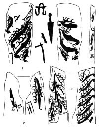 ^ Табл. 87. ( С. 202) Оленные камни. Хубсугульский аймаг. Цагаан уул сумын.1 — оленный камень №2. Озеро Улаан нуур; 2 — оленный камень №1. Озеро Улаан нуур; 3 — оленный камень№1. Посёлок Агар.(Открыть Табл. 87 в новом окне) |