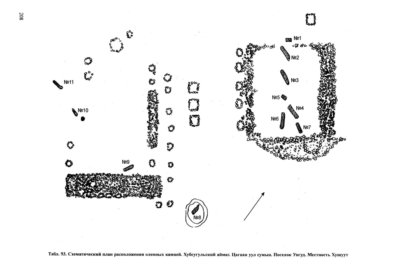 ^ Табл. 93. (С. 208) Схематический план расположения оленных камней. Хубсугульский аймаг. Цагаан уулсумын. Посёлок Увгуд. Местность Хушуут(Открыть Табл. 93 в новом окне) |