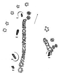 ^ Табл. 85. (С. 200) Схематический план расположения оленных камней. Хубсугульский аймаг. Галт сумын. 3 бригада.(Открыть Табл. 85 в новом окне) |
