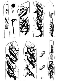 ^ Табл. 99. (С. 214) Оленные камни. Хубсугульский аймаг. Галт сумын. Местность Нухтийн ам.1 — оленный камень №1; 2 — оленный камень №2.(Открыть Табл. 99 в новом окне) |