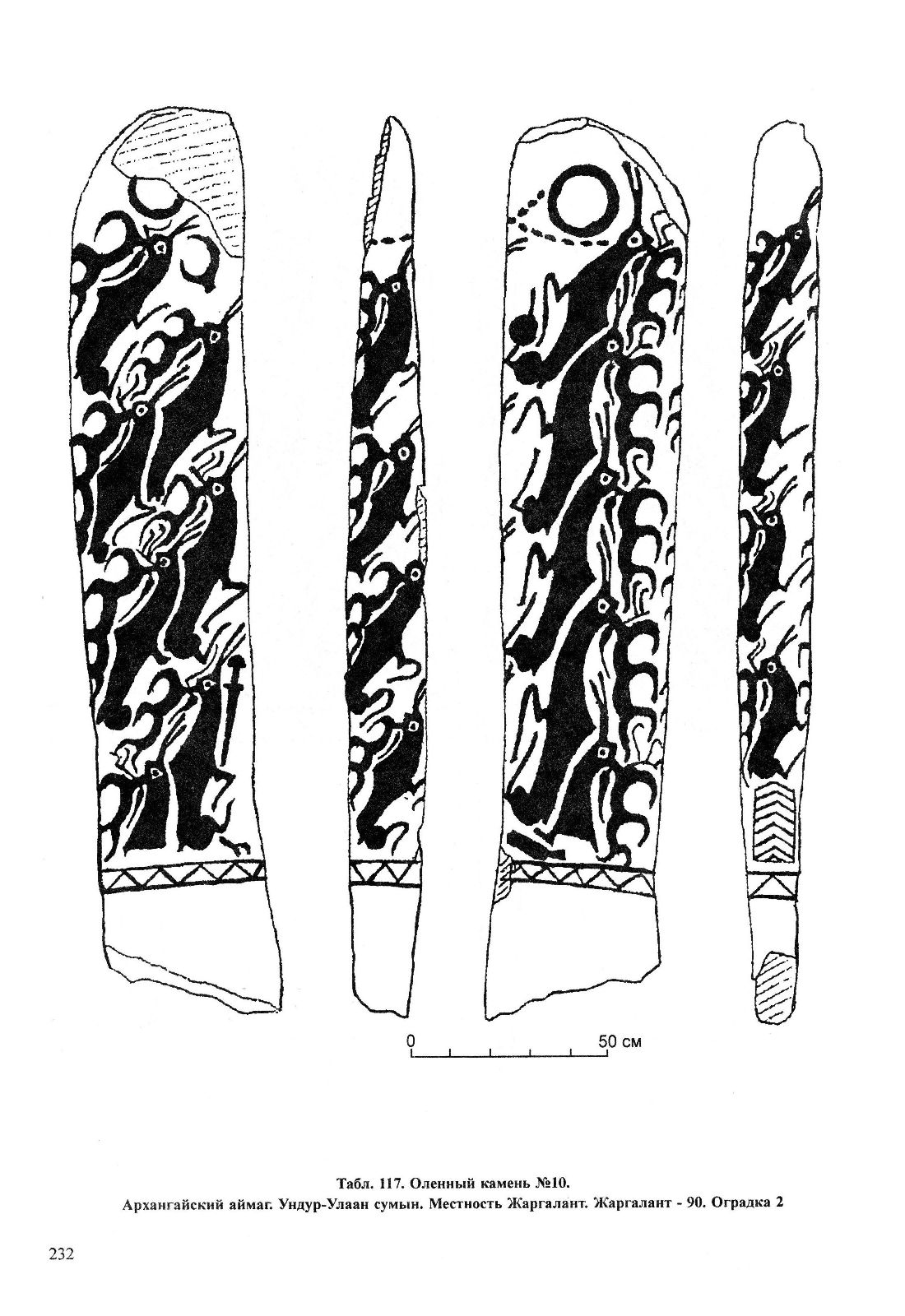 ^ Табл. 117. (С. 232) Оленный камень №10. Архангайский аймаг. Ундур-Улаан сумын. Местность Жаргалант. Жаргалант-90. Оградка 2.(Открыть Табл. 117 в новом окне) |