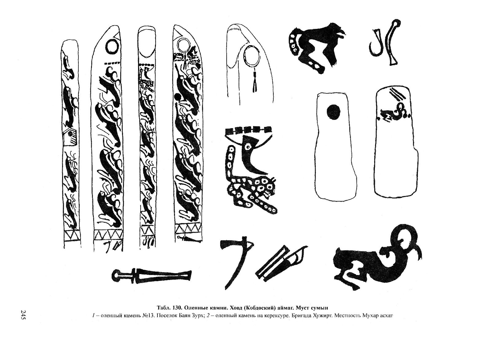 ^ Табл. 130. (С. 245) Оленные камни. Ховд (Кобдоский) аймаг. Муст сумын.1 — оленный камень №13. Посёлок Баян Зурх; 2 — оленный камень на керексуре. Бригада Хужирт. Местность Мухар асхат.(Открыть Табл. 130 в новом окне) |
