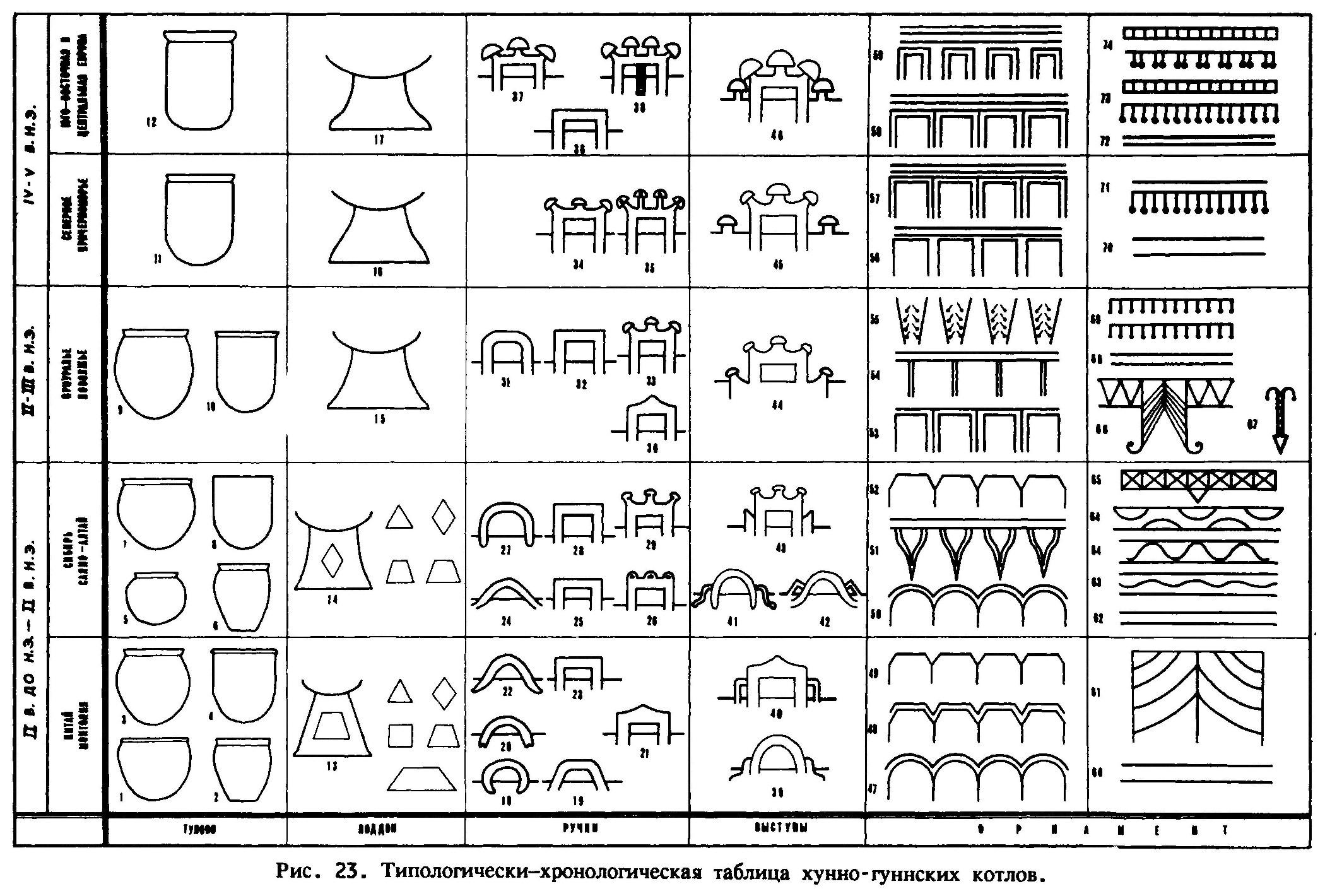 ^ Рис. 23. Типологически-хронологическая таблица хунно-гуннских котлов.(Открыть Рис. 23 в новом окне) |