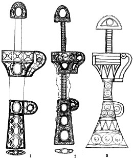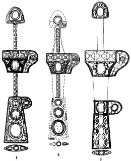 ^ Рис. 29. Три варианта одного типа кинжалов. 1 — кинжал из погребения у озера Боровое; 2 — кинжал из погребения в местности Керим-ло, Южная Корея; 3 — изображение кинжала из грота 69, Восточный Туркестан.(Открыть Рис. 29 в новом окне) |