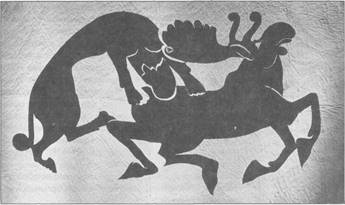 Сцена терзания. Аппликация на войлочном чепраке.IV в. до н. э. Дерево, кожа. Пазырык. Эрмитаж. |